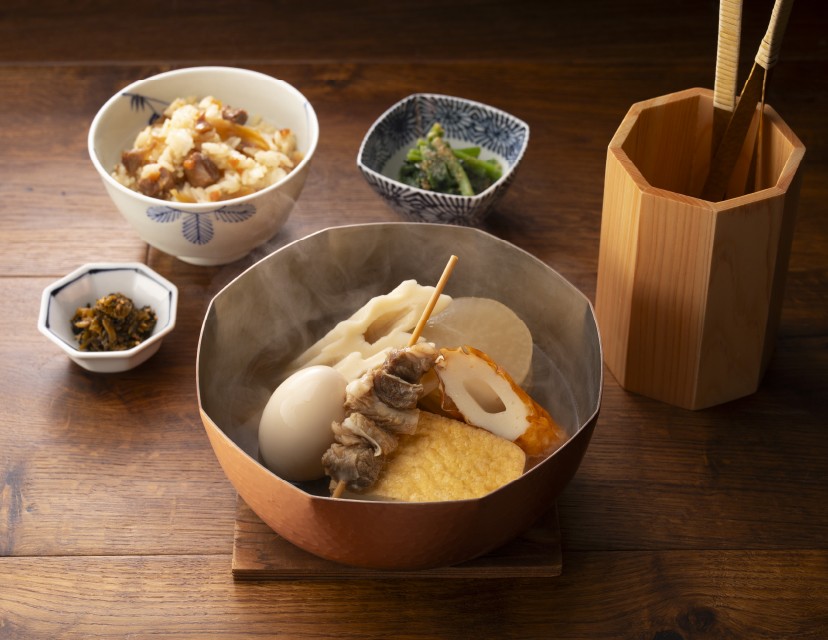おでん五種をメインに、混ぜ込みご飯、小鉢、漬物を添えました。これまでランチタイム限定だった御膳を、お仕事帰りやお買い物の後でもゆっくりとお楽しみいただけるようになります。