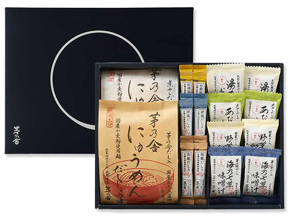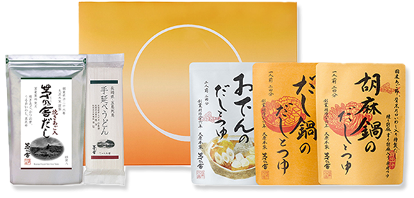 茅乃舎だしをはじめ、鍋の素3種と〆にぴったりのうどんもご一緒にどうぞ。