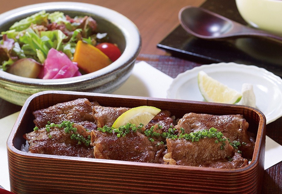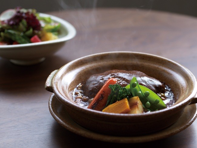 嘉穂牛の挽肉を100%使用し焼き上げた茶舎のハンバーグ。牛だしと野菜だしをベースに、2種類の味噌、トマトピューレを合わせた特製ソースで和風仕立てに。