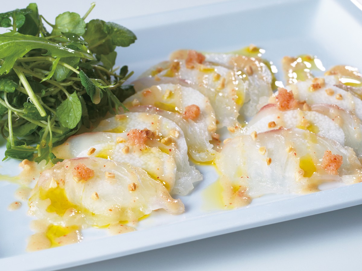 めんたいこソースのカルパッチョ。オリーブオイルとナッツで、香りと食感も楽しめます。